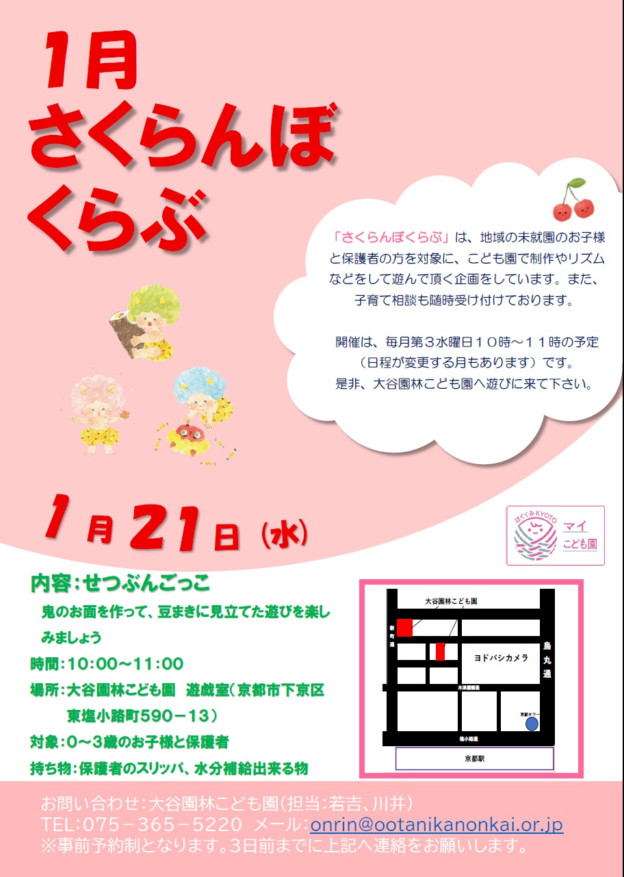 さくらんぼくらぶとは、未就園児のお子様と保護者の方を対象に 製作やリズムあそびなどをして楽しく過ごしていただける子育て支援イベントです!