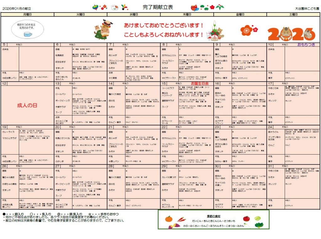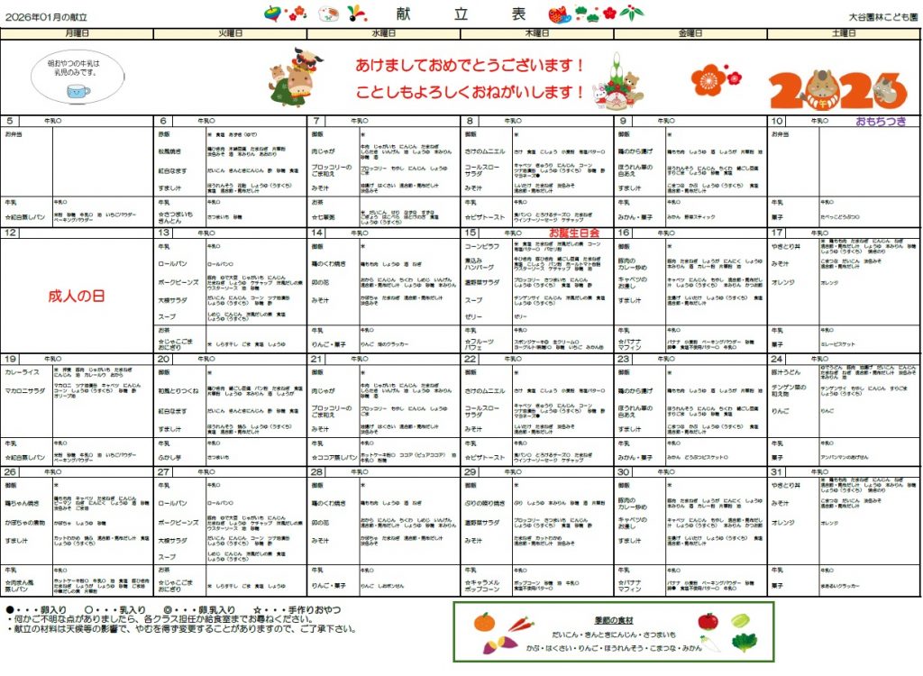 令和8年1月の献立表です。