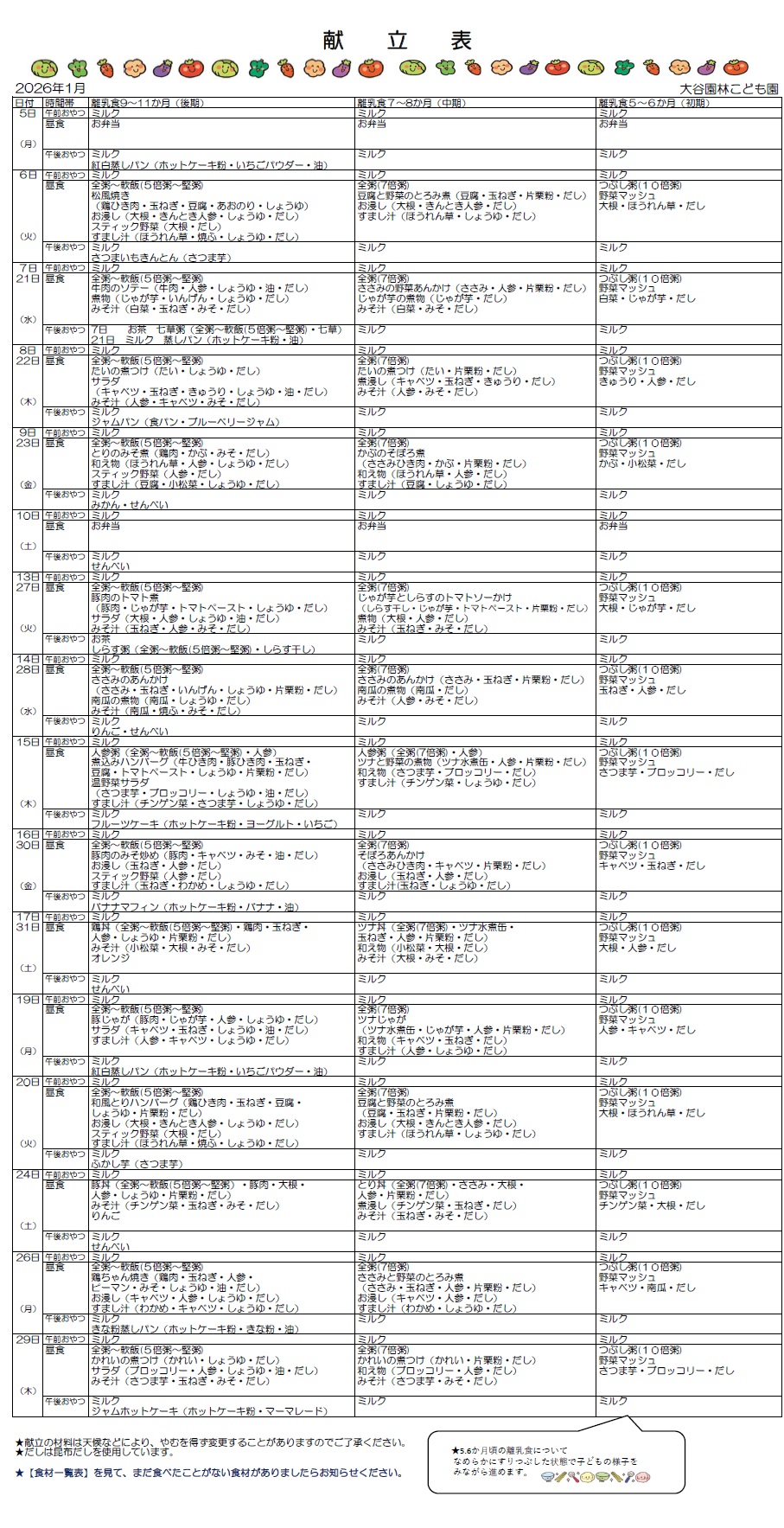 1月離乳食献立(初期~後期)