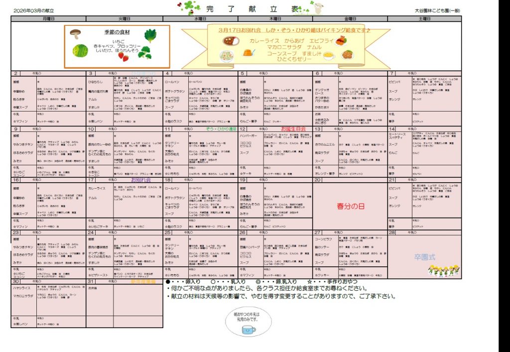 令和8年3月の献立表です。